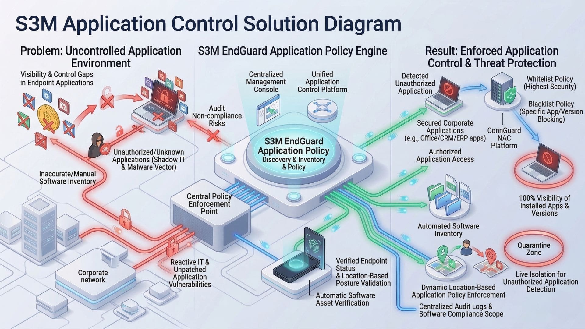 S3M Application Control provides full application visibility and enforces execution policies through a native agent-based architecture.