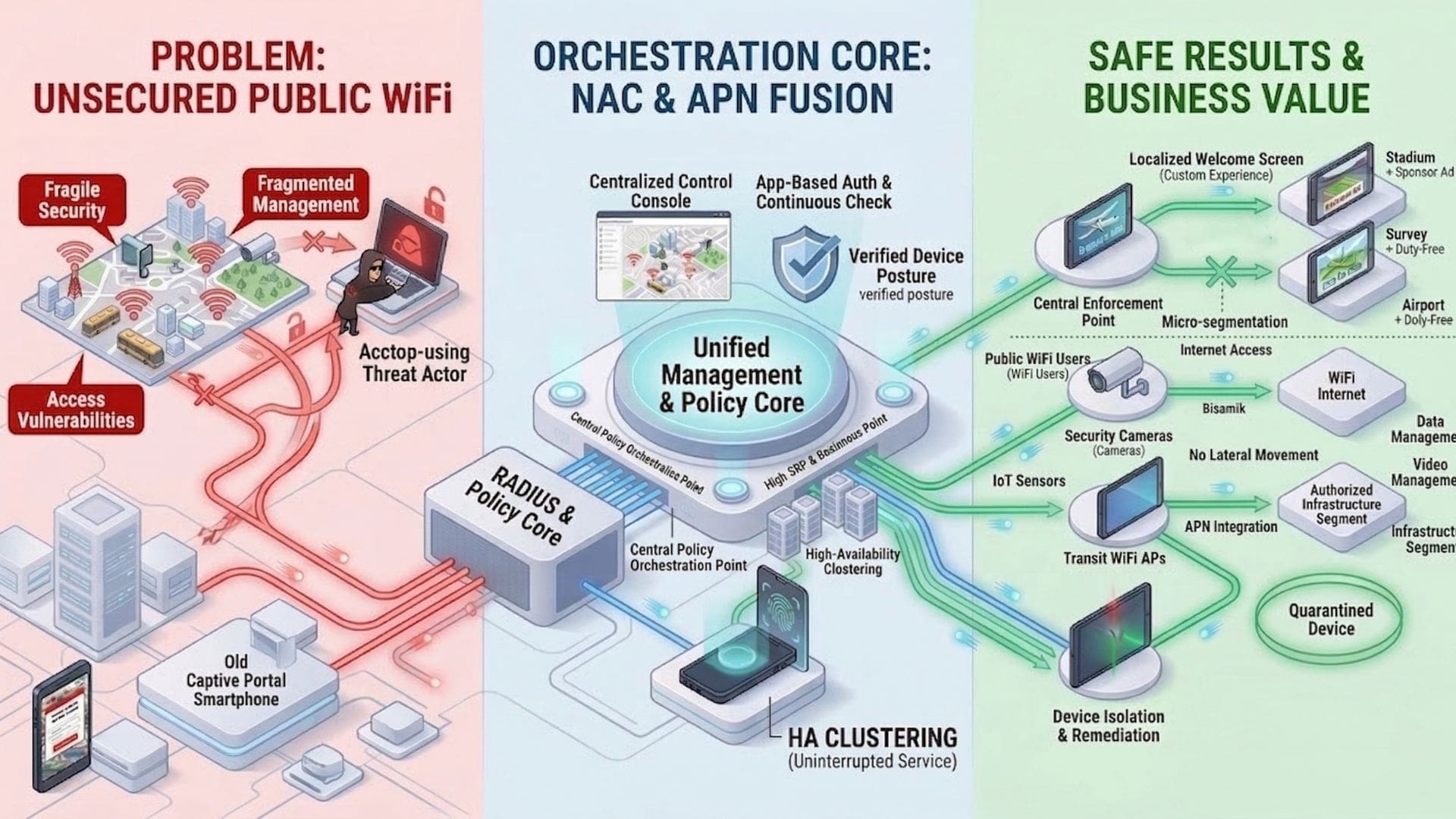 Public WiFi Security ensures that guest users, IoT devices, and infrastructure are isolated, authenticated, and continuously controlled through a centralized security framework.